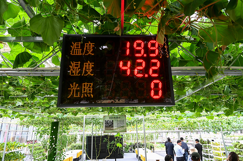 7 सितंबर 2024, शीत्सांग के ल्हासा में राष्ट्रीय आधुनिक कृषि प्रदर्शन क्षेत्र के हाइड्रोपोनिक्स हॉल की तापमान और आर्द्रता प्रदर्शन स्क्रीन पर आर्द्रता सहित अन्य जानकारी दिखाई दे रही है। (VCG)