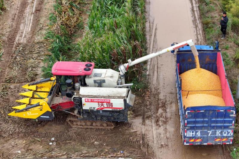 11 अक्तूबर को, शानदोंग प्रांत के हेझे शहर के श्वांगचियाओ गाँव में किसान कटे हुए मक्का को गाड़ी में भर रहे थे। (शिन्हुआ समाचार ऐजेंसी)