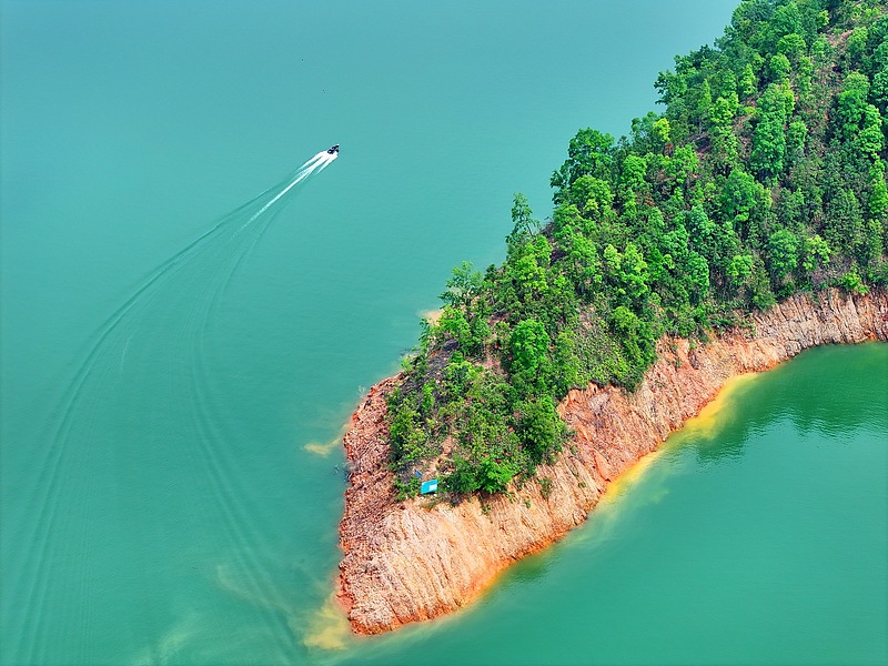 2 जून 2025, जिआंगशी प्रांत गानझोउ में यांगमिंग झील राष्ट्रीय आर्द्रभूमि उद्यान में, आर्द्रभूमि संरक्षण कर्मी नाव चलाकर दैनिक गश्ती कार्य कर रहे हैं। (VCG)