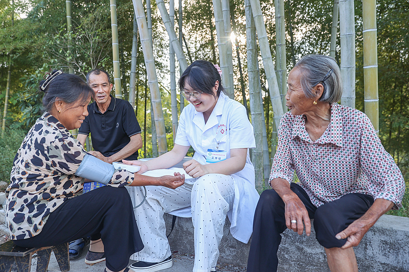 13 अगस्त 2025, जिआंगशी प्रांत जिउजियांग में मात्र 23 वर्ष की ग्रामीण चिकित्सक वू जिंगयी गाँव में ग्रामीणों का रक्तचाप मापते समय उनसे बातचीत कर रही थीं। (VCG)